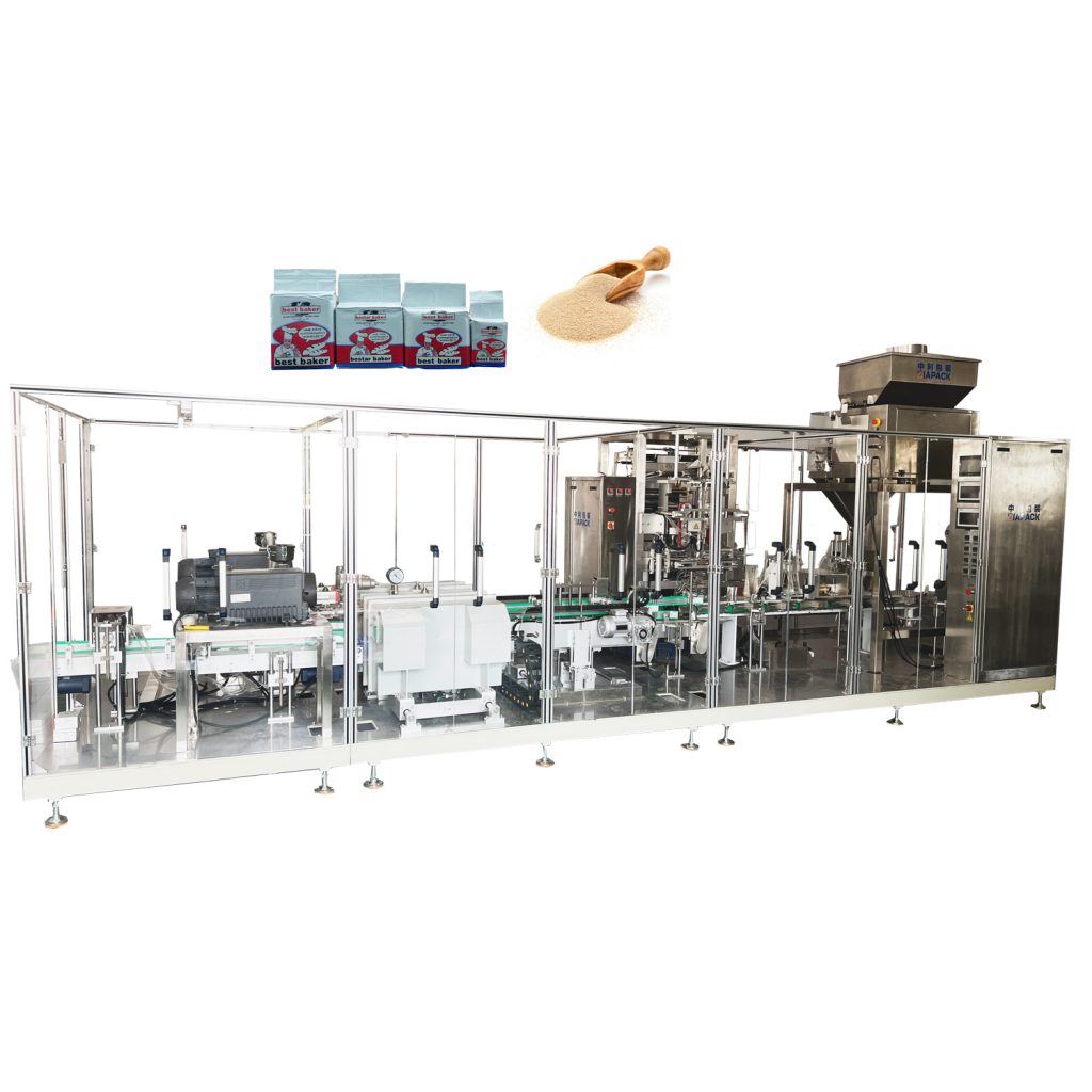 உலர் ஈஸ்டுக்கு உணவளிக்க ஒரு செட் ZK3 வெற்றிட எலிவேட்டர், ஒரு செட் ZL520 செங்குத்து பையில் பேக்கிங் மற்றும் சீல் செய்யும் இயந்திரம். ஒரு செட் ZLC4-2000 நான்கு பக்கெட் எடையுள்ள இயந்திரம், ஒரு செட் ZL-100V2 இரட்டை வெற்றிட அறை பேக்கிங் இயந்திரம். இந்த இயந்திரம் உணவு மருந்தக ரசாயனம் மற்றும் பிற தயாரிப்புகளை தூள் அல்லது சிறிய துகள்களில் பேக்கிங் செய்ய பரவலாகப் பயன்படுத்தப்படுகிறது. காபி தூள், ஈஸ்ட் பவுடர் கோதுமை மாவு மற்றும் பல போன்ற .முழு இயந்திரம் உள்ளே பம்ப் செய்து வெற்றிட தயாரிப்பு. வெற்றிட அளவு மிக அதிகமாக உள்ளது மற்றும் பேக்கிங் வேகம் மிக அதிகமாக உள்ளது 30பேக்/நிமிடத்தை அடையலாம் .முடிக்கப்பட்ட தயாரிப்பு நீண்ட ஆயுளும் அழகான வடிவமும் கொண்டது.