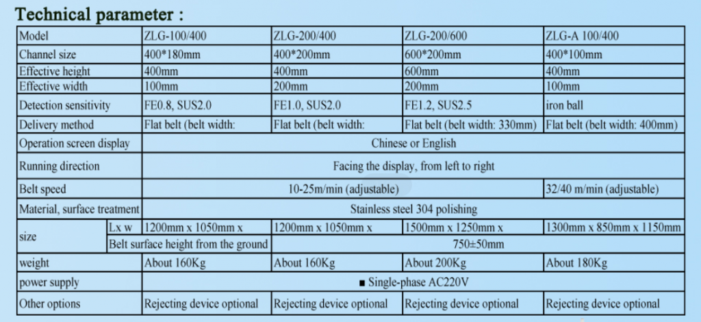 சாக்லேட், உருளைக்கிழங்கு சில்லுகள், பால் பவுடர் தொத்திறைச்சி, ஊறுகாய் தயாரிப்புகள் போன்ற பொருட்கள் போன்ற அலுமினிய தாள்களில் உள்ள இரும்பு மற்றும் துருப்பிடிக்காத எஃகுகளை கண்டுபிடிப்பதற்கான விருப்பம்.